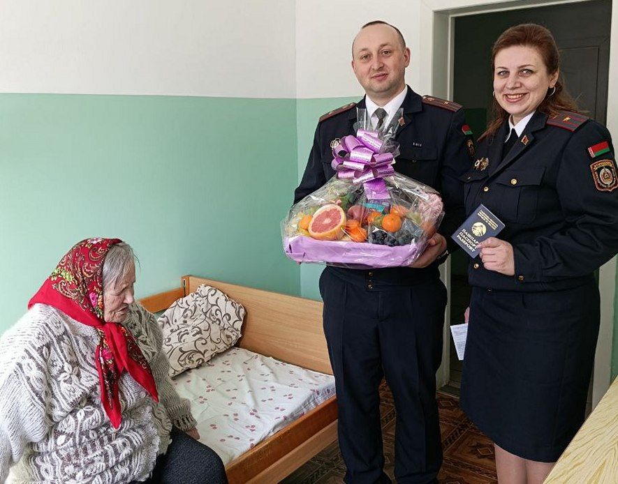 Из райотдела милиции к юбилярше приехали начальник отделения по гражданству и миграции Елена Скадорва и замначальника отдела охраны и профилактики Роман Иванец.