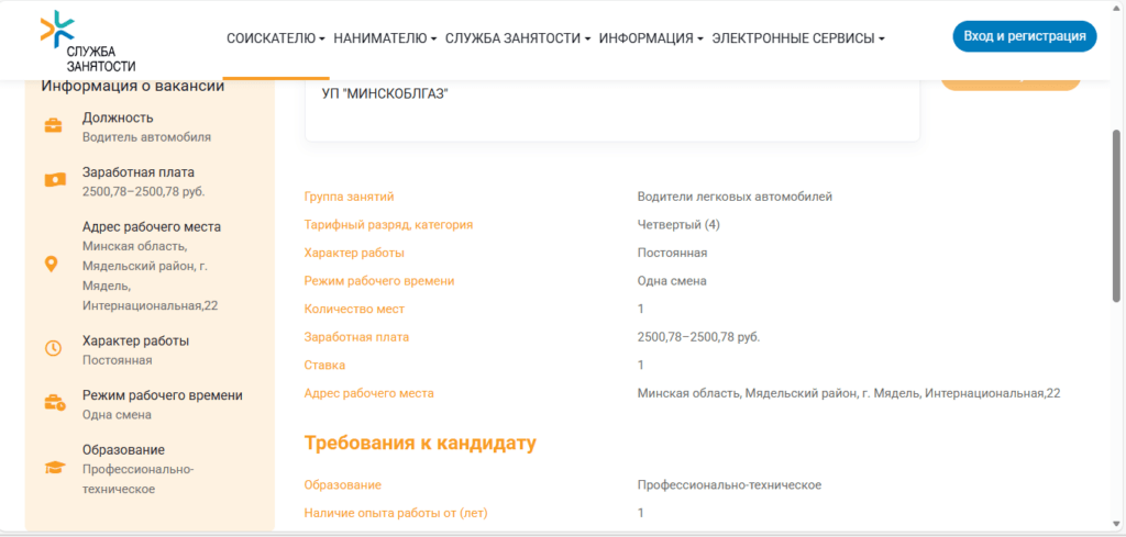 Предприятие «МИНСКОБЛГАЗ» ищет водителя легкового автомобиля за зарплату 2500 рублей в месяц. Вполне неплохо! Указано, что предпочтение отдадут сотруднику с опытом работы от 1 года и профессионально-техническим образованием.