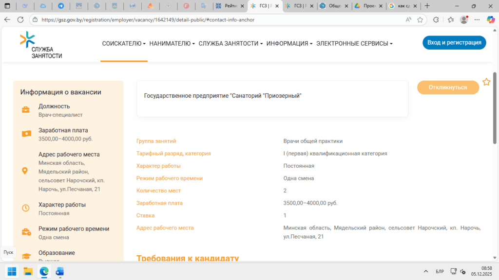 На сей раз приглашают врача-гинеколога-акушера в санаторий «Белая Русь». Специалисту готовы платить приличные 2500–3500 рублей. Само собой, основным требованием к кандидату является наличие профильного высшего образования. Должность-то ответственная.