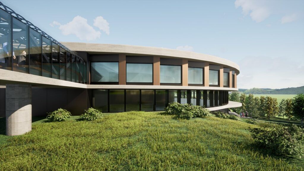 Новый комплекс выполнен в современном архитектурном стиле — округлая форма, панорамное остекление, естественное вписывание в ландшафт. Здание словно вырастает из зеленого склона, открывая живописные виды на озеро и лес. Архитектура подчеркивает ощущение света, воздуха и связи с природой.