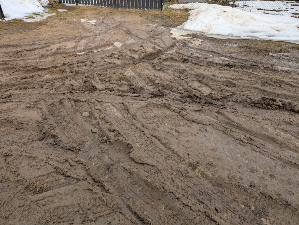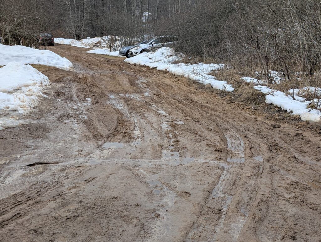В период таяния снега и дождей покрытие холмистой грунтовой дороги размывается, появляется колея. К слову, сейчас как раз такой период и действительно – один неосторожный шаг — и нос черного ботинка на толстой подошве становится коричневым от жидкой глины.