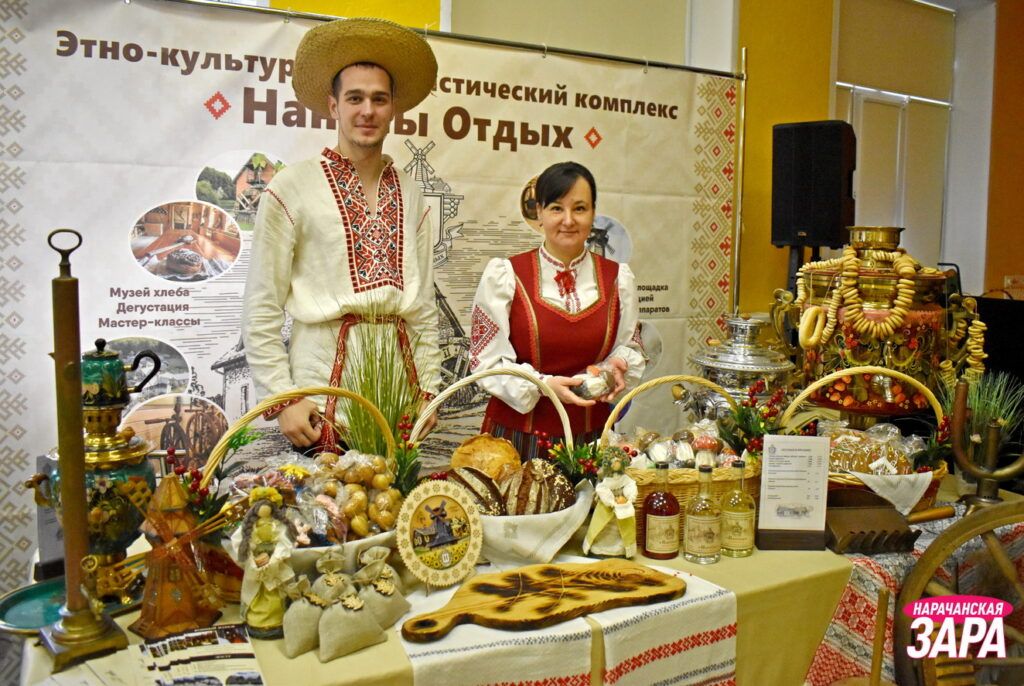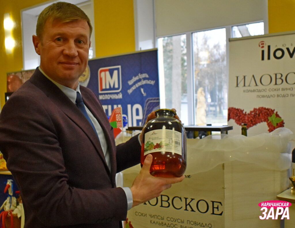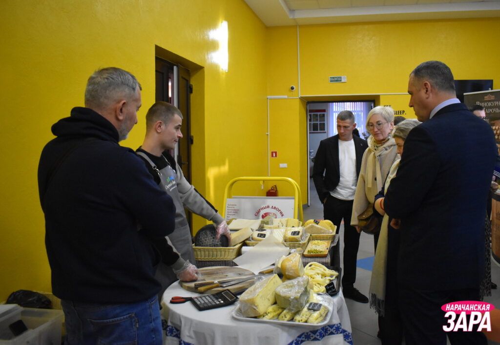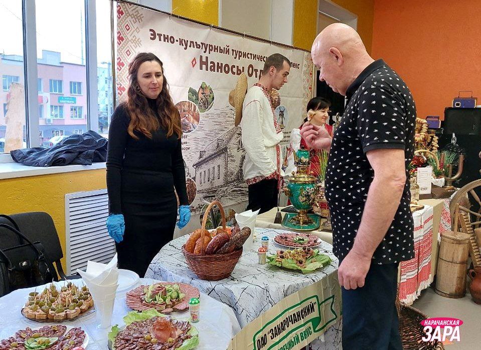 А ў танцавальнай зале – выставы прадукцыі мясцовых вытворцаў. У тым ліку былі і навінкі. Напрыклад, каўбасныя вырабы ад «Занарачанскага».