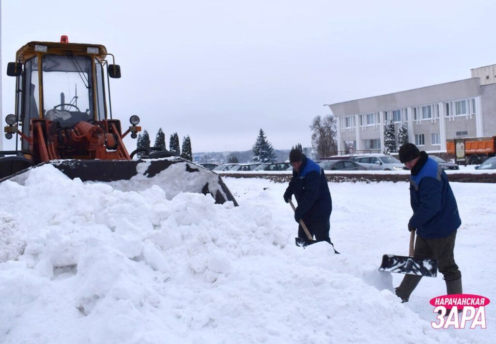 Сегодня Мядельское жилищно-коммунальное хозяйство убирает снег в центре города.