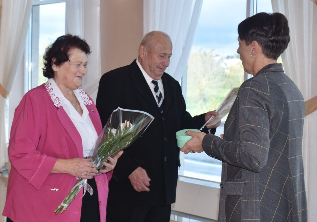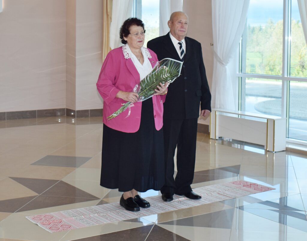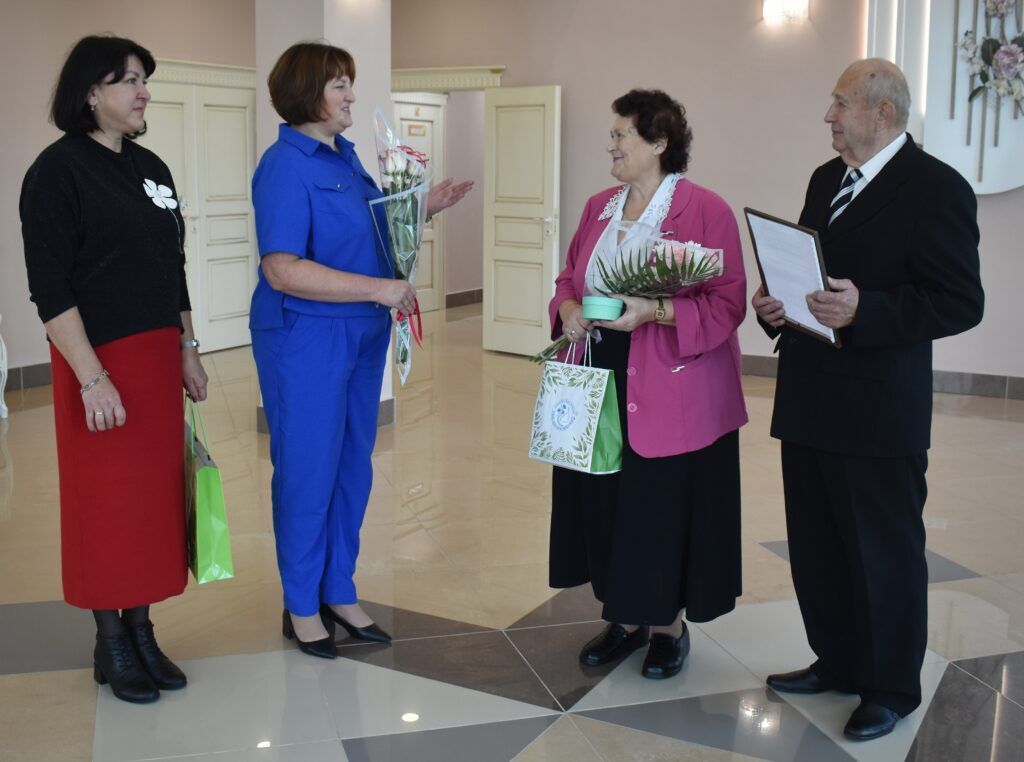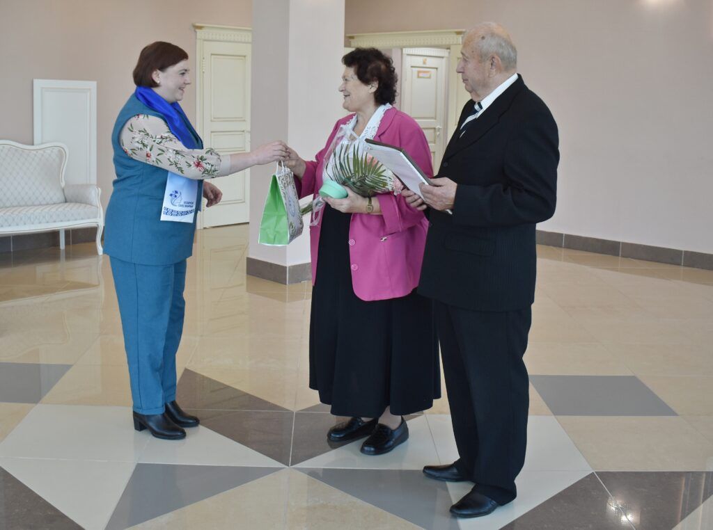 І, канечне, прымалі віншаванні і падарункі. А віншавалі іх начальнік аддзела ЗАГС райвыканкама Галіна Калмук, намеснік старшыні раённай арганізацыі Беларускага Саюза жанчын Наталля Шастаковіч, намеснік дырэктара Мядзельскага тэрытарыяльнага цэнтра сацыяльнага абслугоўвання насельніцтва Алены Яновіч і загадчыца аддзялення першаснага прыёму, аналізу, інфармавання і прагназавання гэтай установы Людміла Перагуда.