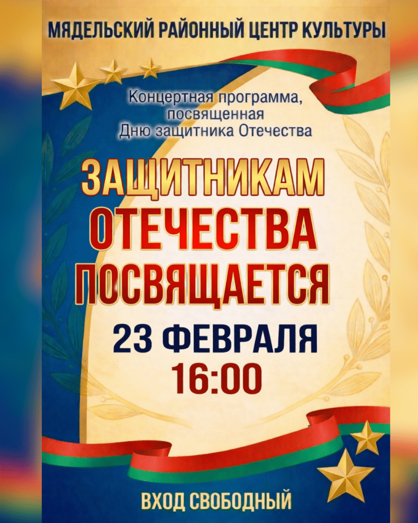 Мядельский районный Центр культуры приглашает жителей и гостей города на праздничную концертную программу, приуроченную к Дню защитника Отечества.