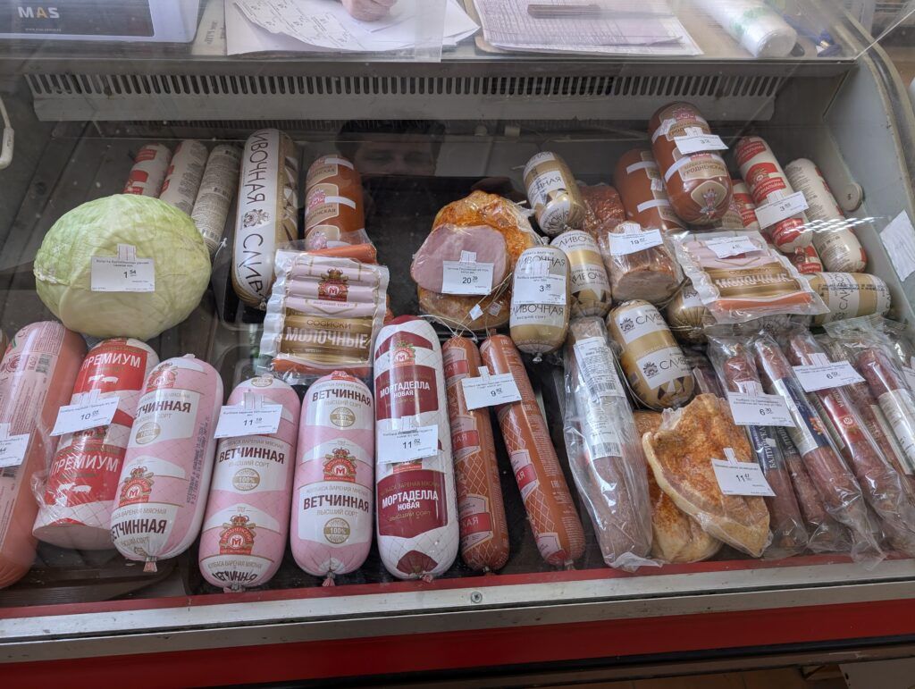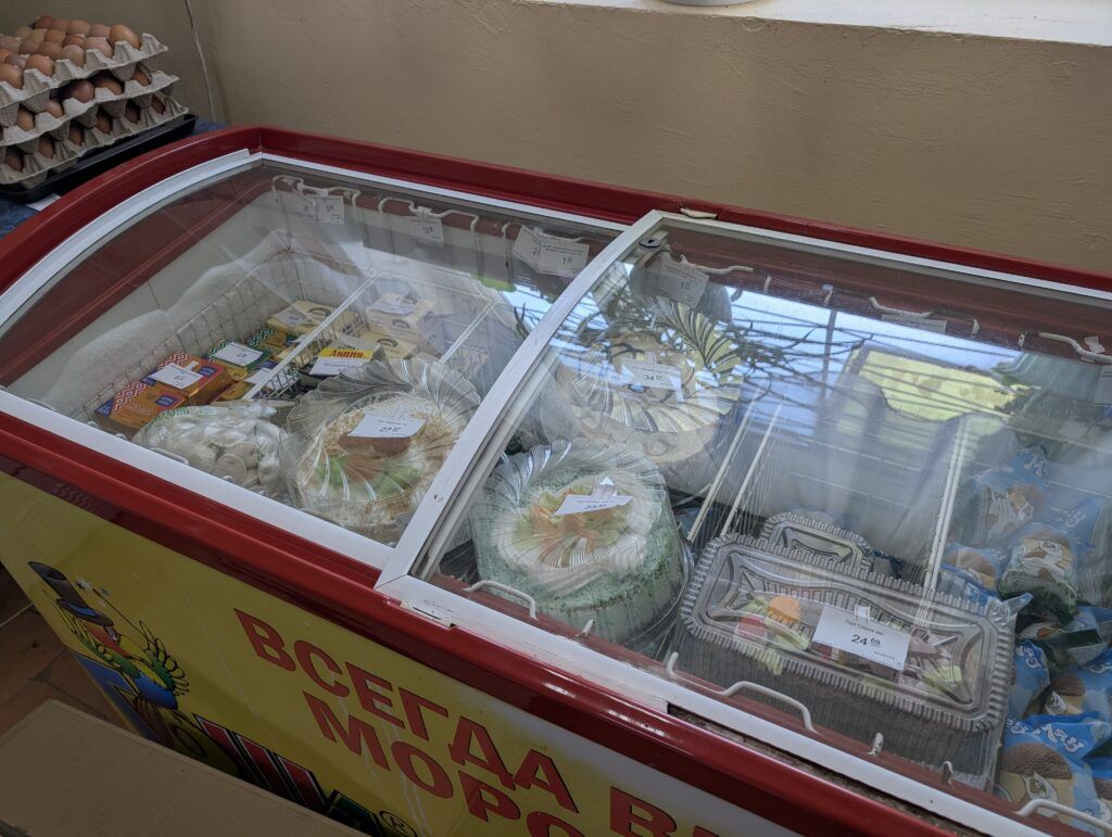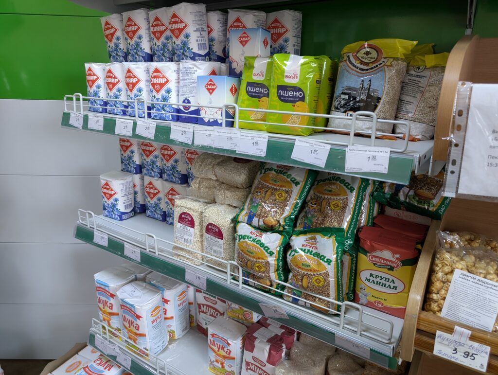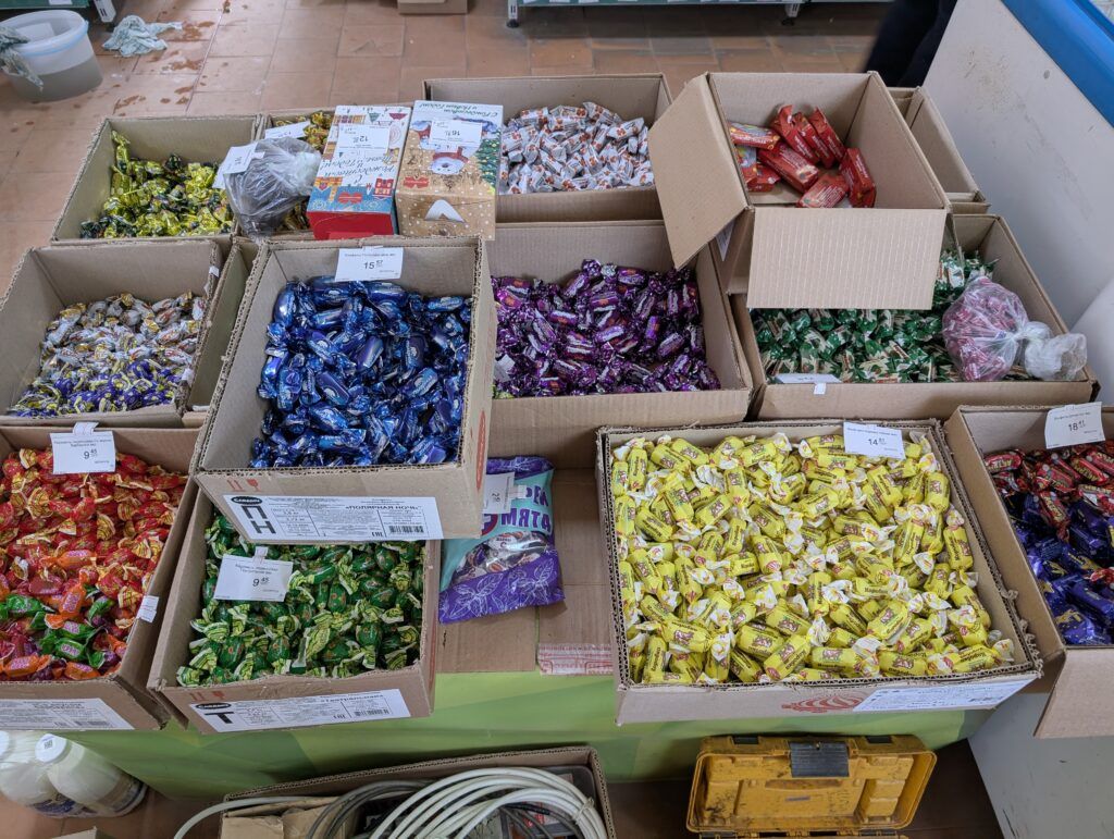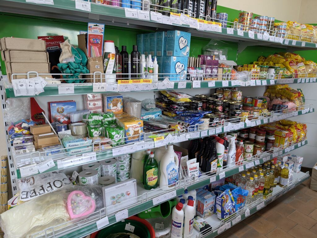 На прилавках магазина представлены крупы, колбасные изделия и кондитерские товары. В холодильниках – молочная продукция и торты. В наличии бакалея: сахар, печенье, растительное масло и сгущенное молоко. Покупатели могут приобрести прорезиненные перчатки, скотч, средства для мытья посуды, салфетки, мыло и многое другое.