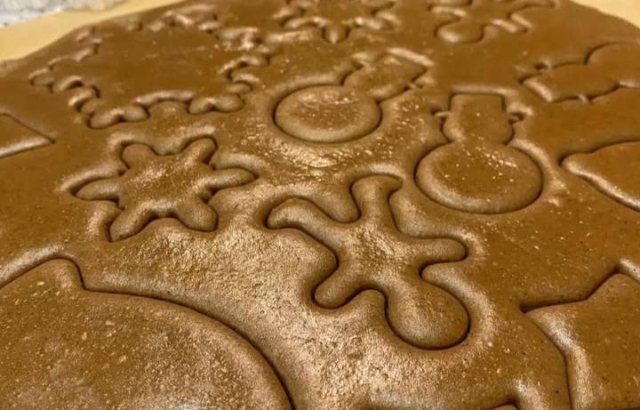 Достаем тесто из холодильника, даем немного времени нагреться. Раскатываем его на силиконовом коврике или бумаге для выпечки в пласт толщиной 5 мм. Вырезаем нужные фигурки при помощи формочек, лишнее тесто убираем. Я всегда стараюсь во время нового приготовления имбирных пряников разноообразить фигурки, чтобы угощение выглядело по-разному. Лучше не располагать пряники близко друг к другу, чтобы во время выпечки не слиплись, так как они начнут увеличиваться в размере.