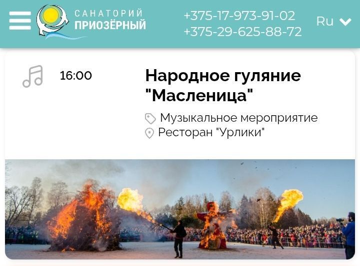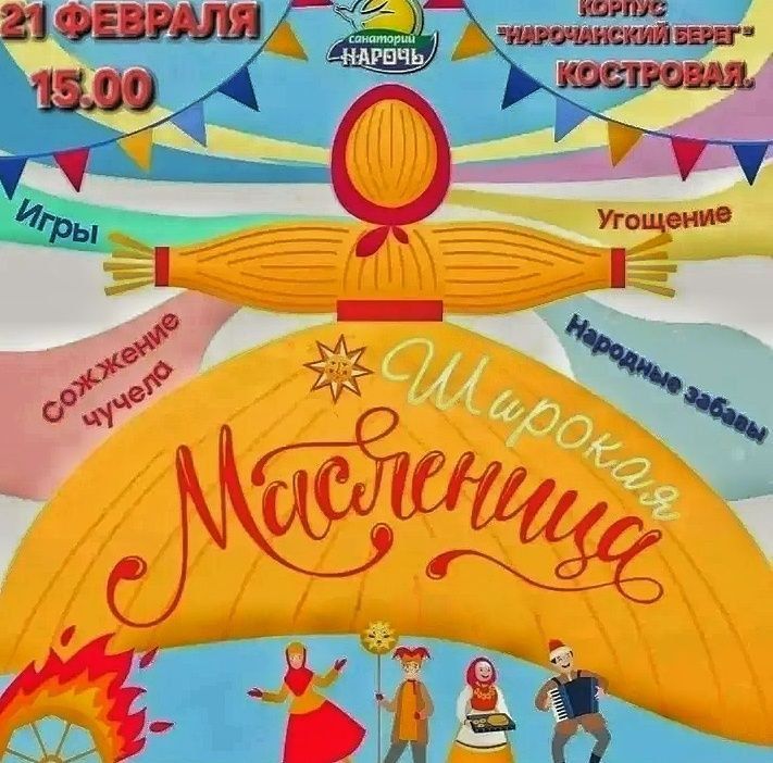 В корпусе «Нарочанский берег» санатория «Нарочь» в 15:00 стартует «Широкая Масленица». Гостей ждут игры, мастер‑классы по ремёслам, ярмарка сувениров, блины с начинками, чай и мёд. Завершится праздник традиционным сожжением чучела.
