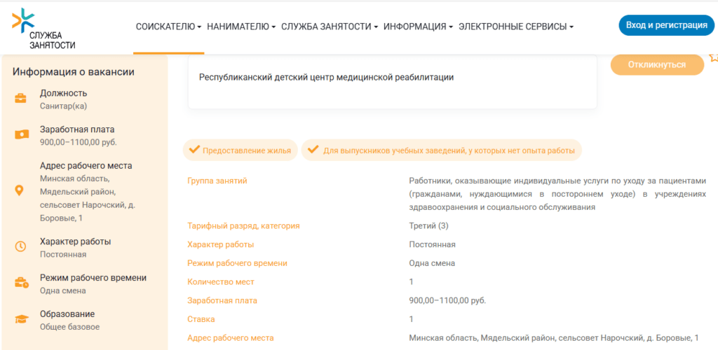 А Республиканский детский центр медицинской реабилитации в деревне Боровые нуждается в надежном работнике, который сможет ухаживать за пациентами, которым необходимо постоянное внимание. Цена вопроса – от 900 до 1100 рублей. От кандидата с общим базовым образованием требуется внимательность и аккуратность в выполнении поставленных задач! Наниматель обещает предоставить комнату в общежитии, что может быть для кого-то решающим плюсом. Вакансия хороша для выпускников учебных заведений, у которых нет опыта работы.