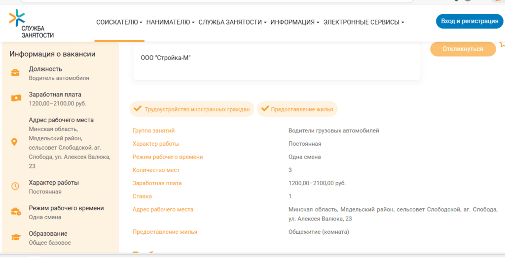 А организации ООО «Стройка-М», что находится в агрогородке Слобода, не хватает водителя грузовых автомобилей. Здесь специалисту готовы платить относительно щедро – 1200-2100 рублей. А еще обязуются предоставить жилье в виде комнаты в общежитии и согласны трудоустроить иностранных граждан.
