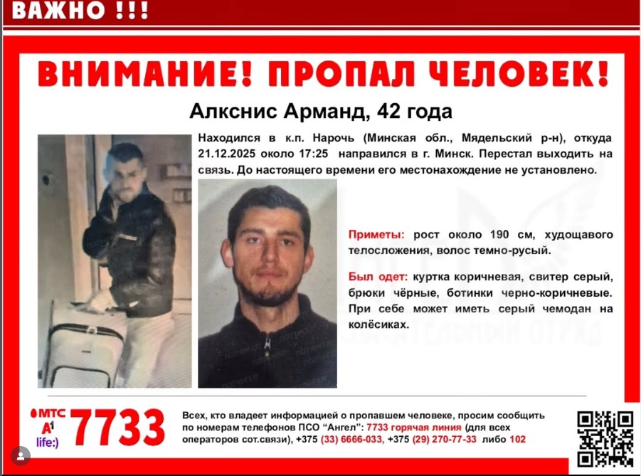 Ищут Арманда Алксниса, 42 года. Находился в курортном поселке Нарочь, откуда 21 декабря около 17:25 направился в Минск – с этого времени перестал выходить на связь и его местонахождение не установлено, сообщает поисково-спасательный отряд «Ангел».