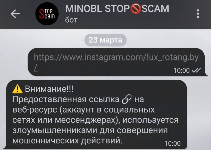 Для проверки подозрительных интернет-ресурсов используйте официальный Telegram-бот MINOBLSTOPSCAM, который доступен в мессенджере «Telegram» @borisovstopscam_bot.