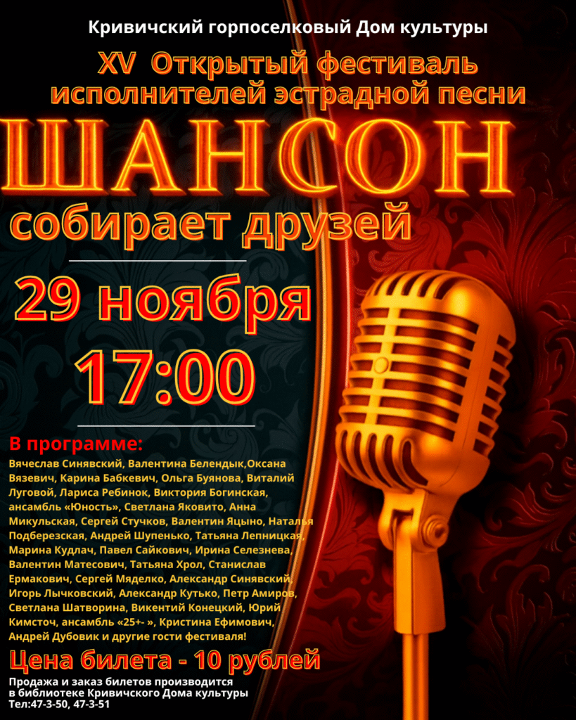 XV Открытый фестиваль исполнителей эстрадной песни «Шансон собирает друзей» пройдет 29 ноября в Кривичском горпоселковом Доме культуры.