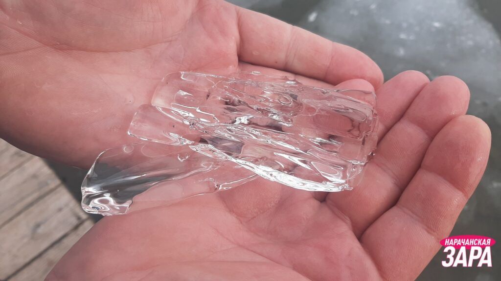 – Около берега даже лебеди проваливаются! Что говорить про людей, – утверждает матрос-спасатель Виталий Таразевич. – Даже могу вам показать, как легко беру глыбу в руки. Она рассыпается на иголки.