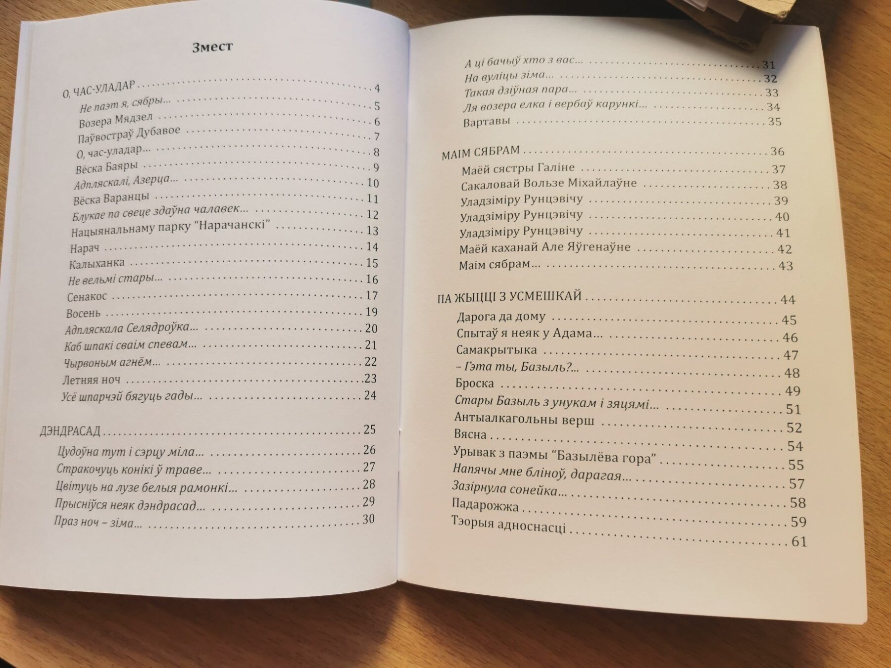 В сборнике четыре раздела. Первый называется «О, час–уладар». В нем собраны стихи автора, посвященные родным местам. В том числе деревням Бояры, Воронцы, Национальному парку «Нарочанский», Нарочи, озеру Мядель. Второй раздел называется «Дендросад». Кроме стихов, опевающих этот удивительный уголок природы, есть также строки, посвященные первой «хозяйке» дендросада Раде Ярошевич и лесничему Мядельского лесничества Георгию Войтюльяну. И хоть обоих нет уже на этой земля, но память о них жива в серцах тех, кто их знал, с ними работал.