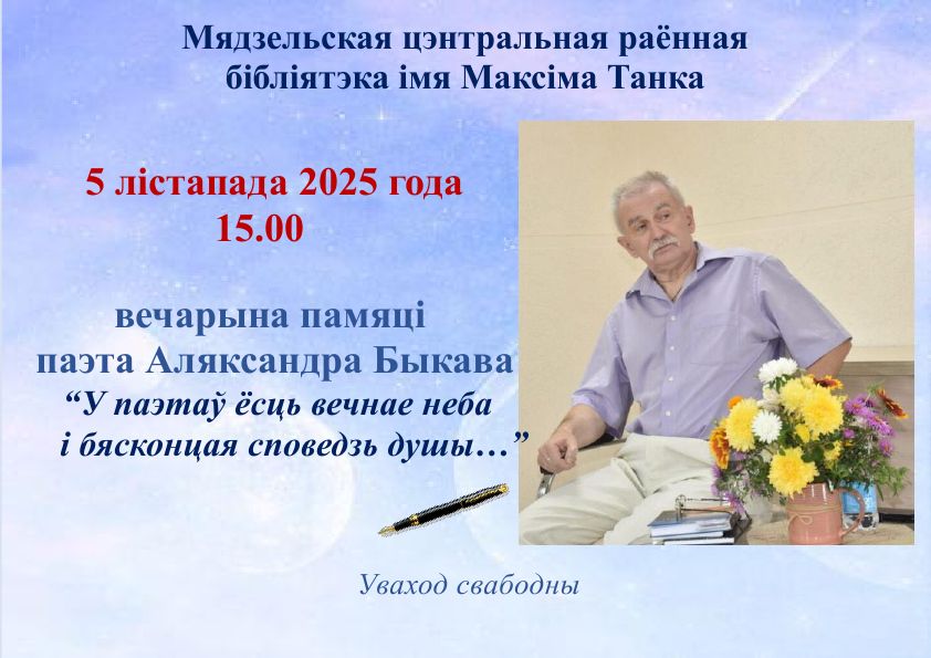 А 5 лістапада ў бібліятэцы адбудзецца вечарына памяці Аляксандра Быкава «У паэтаў ёсць вечнае неба і бясконцая споведзь душы…». Пачатак – а 15-й гадзіне. Уваход свабодны.