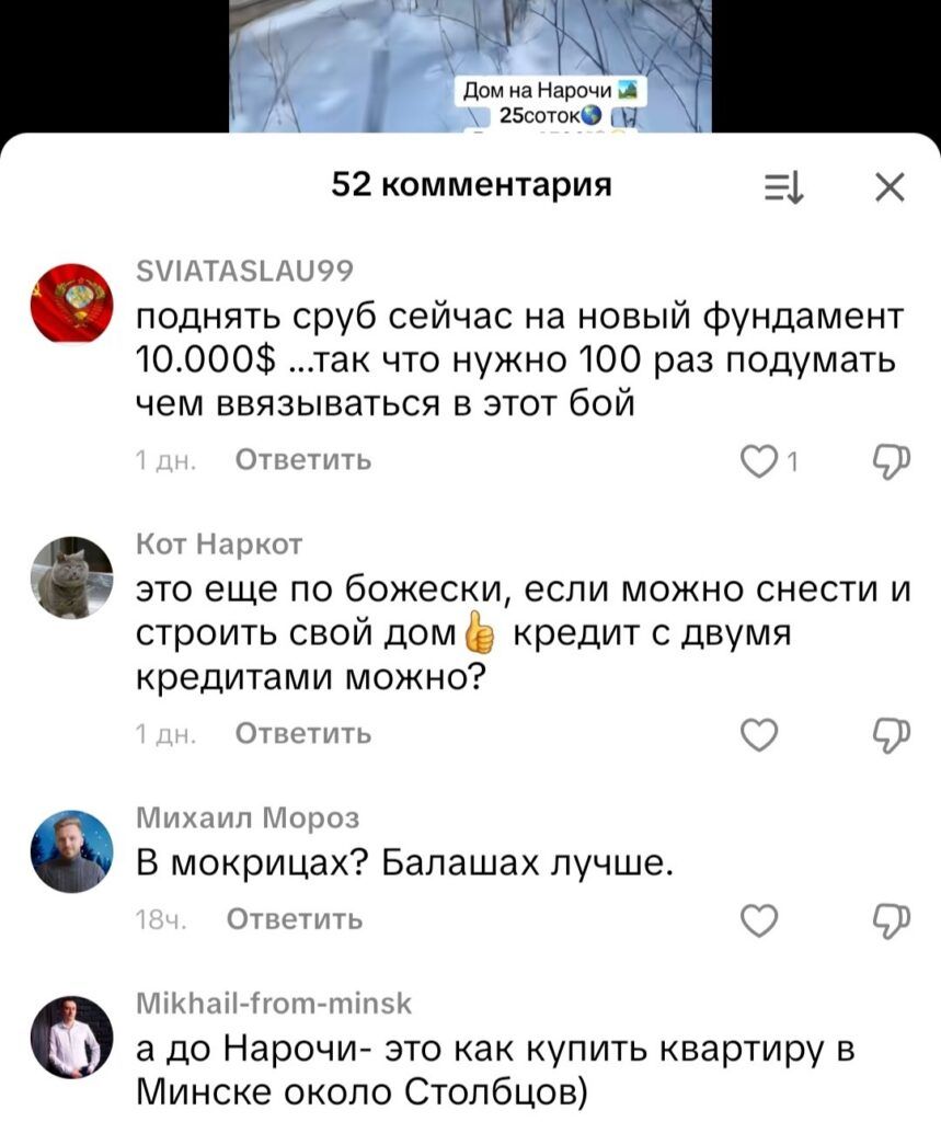 «Вы просили найти вариант дома подешевле на Нарочи… Так вот он есть, и очень даже симпатичный!» – так начинает свой очередной эмоциональный ролик в ТикТок агент по недвижимости. Речь идет о бревенчатом доме в деревне Мокрица в трех километрах от озера Нарочь. Цена вопроса – почти 5000$.