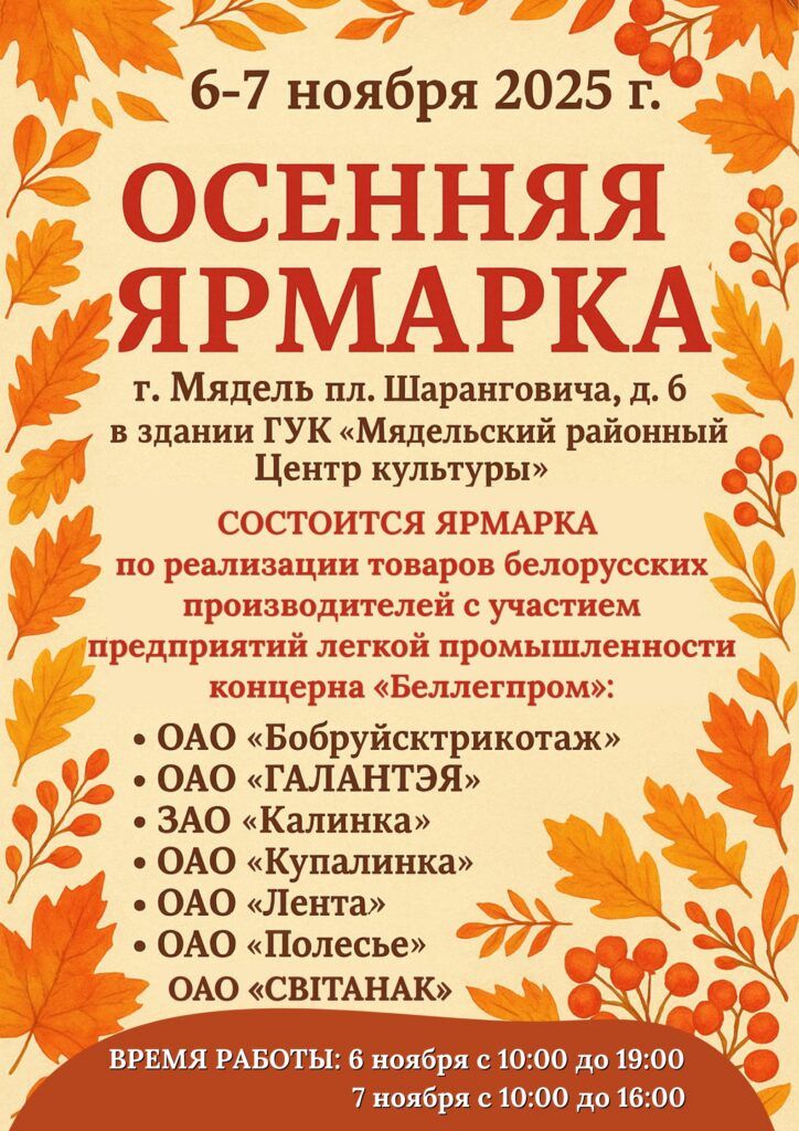 6 и 7 ноября в здании Мядельского районного Центра культуры состоится большая ярмарка с товарами белорусских производителей.